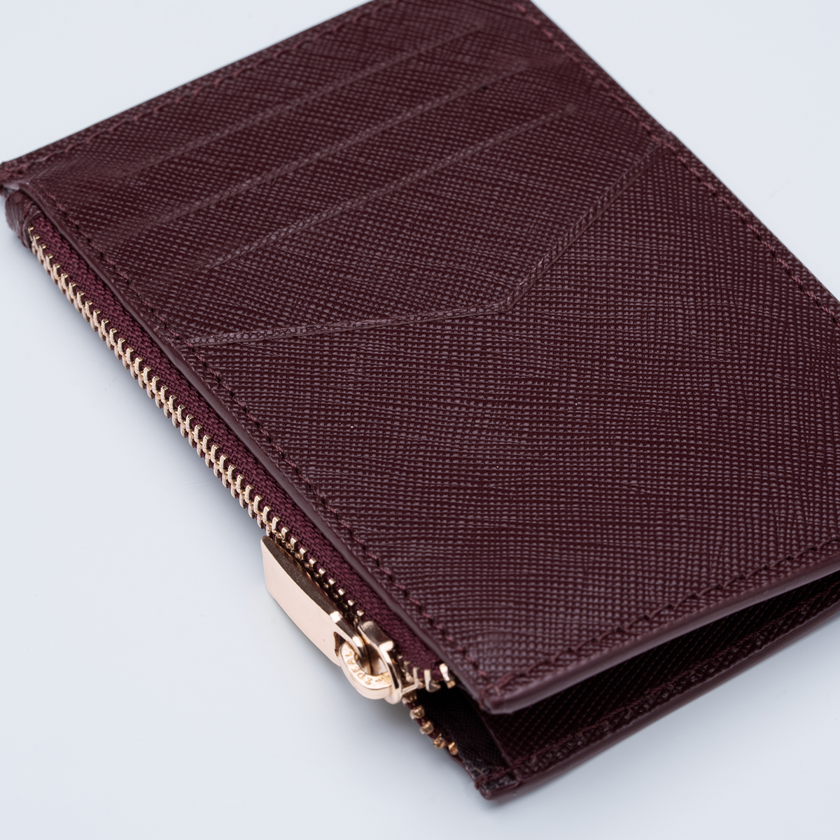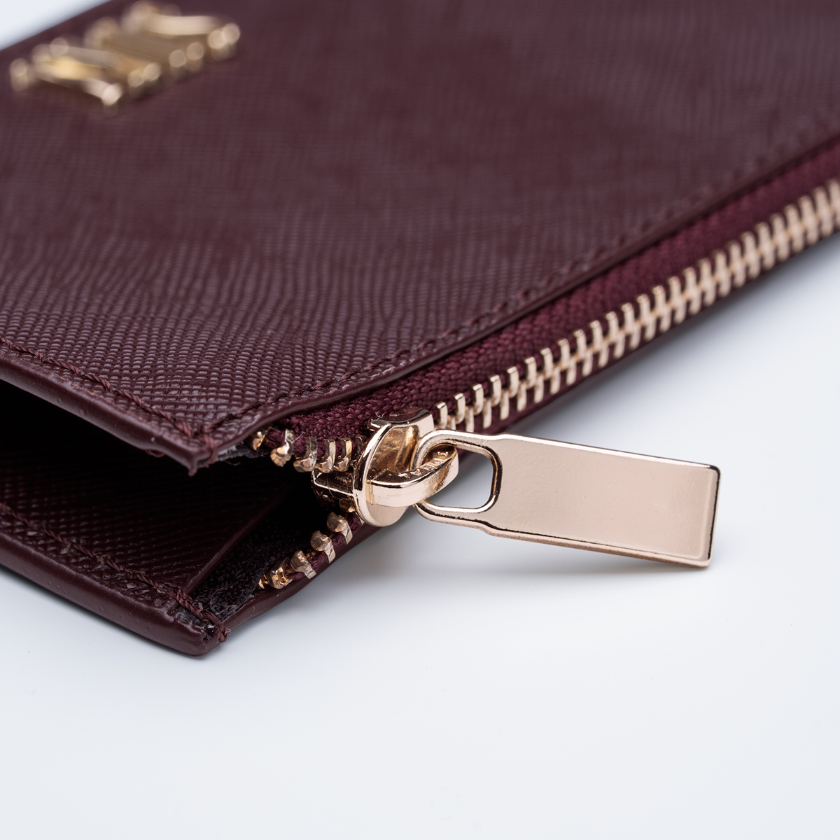 The secure zip closure protects coins and cash while maintaining a slim, fluid profile.